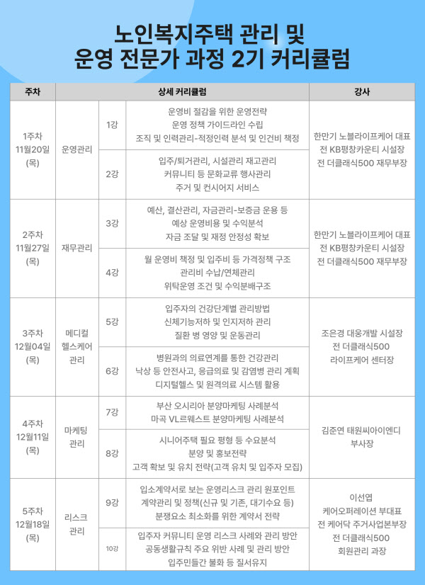 교육은 ▲운영관리 ▲재무관리 ▲메디컬 헬스케어 ▲마케팅 ▲리스크관리 등 다섯 개 분야로 나뉘어 진행한다. 첫 강의에서는 한만기 노블라이프케어 대표가 시니어주택 운영 및 조직관리, 운영비 절감을 위한 운영 전략 등을 다룬다. 재무관리 파트에서는 자금운용·수익률 분석 노하우를 소개한다.