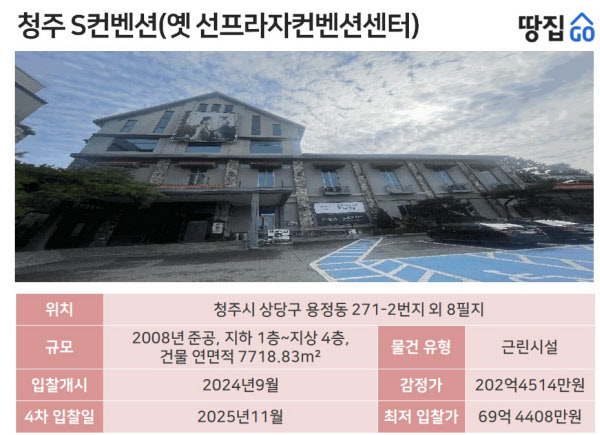 [땅집고] 한때 ‘웨딩 메카’로 불렸던 충북 청주시 상당구 용정동 ‘청주 S컨벤션’(옛 선프라자컨벤션센터)가 법원 경매 시장에서 찬밥 신세가 됐다. 작년 9월 경매 개시 결정이 났고 최근 세번째 입찰에서도 주인을 찾지 못해 최저 입찰가격이 감정가의 3분의 1 수준으로 떨어지며 시장에 충격을 주고 있다.