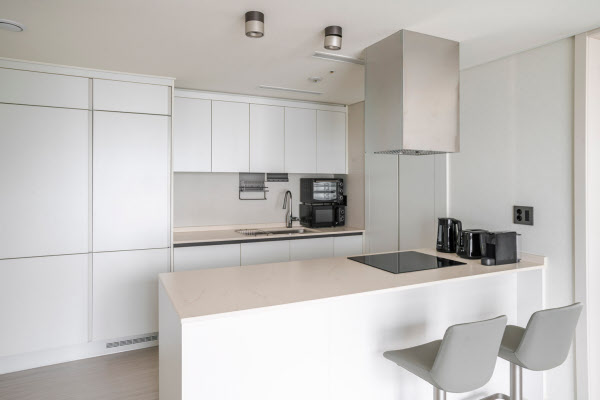 블루그라운드가 입점한 9층 호실은 2베드룸 구조다. 내부로 들어가니 베이지색 대형 아일랜드 식탁이 눈에 띄었다. 공간을 분리하는 동시에 수납과 조리 등 다양한 기능을 갖췄다. 방과 거실에 각각 커다란 창이 있어 통풍과 채광이 우수하다. 침실에는 대형 드레스룸과 붙박이장이 있어 짐 보관하기 편리하다. 신혼부부나 1·2인 가구가 거주하기에 부족함이 없어 보였다.
