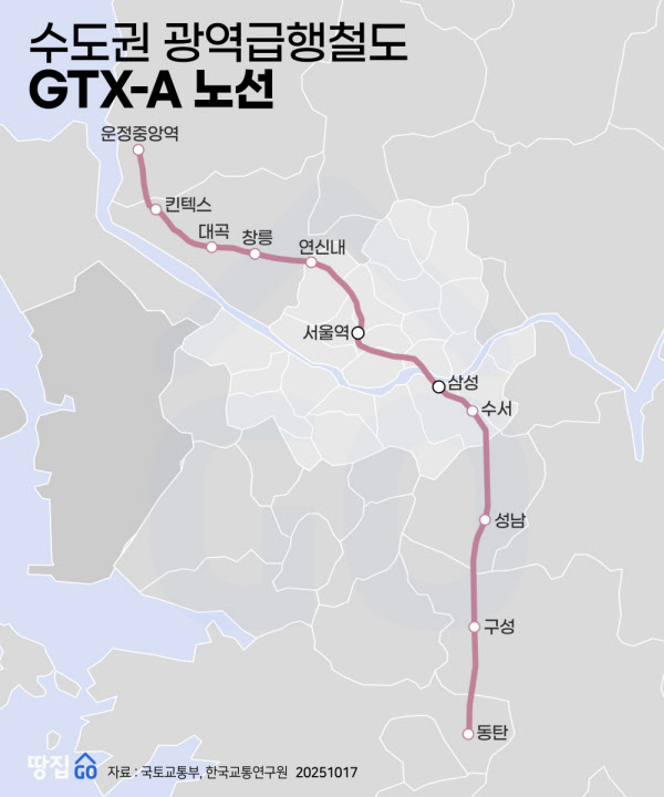 현재는 노선 중심부는 단절된 채 경기 북부 운정중앙~서울역, 남부 수서~동탄 구간이 각각 따로 연결되어 있지만 내년이면 강남 삼성역을 무정차 통과해 두 노선이 하나로 연결되고, 향후 삼성역에도 정차할 예정이다. 아직까지 강남 삼성역 개통시기가 불확실하지만, GTX가 파주운정역에서 삼성역을 거쳐 수서역에 정차하기만 해도 강남 대치동이나 압구정동 등으로 이동하기 편리해지기 때문에 GTX역세권 주변 아파트는 이전과는 완전히 다른 입지를 갖게될 것이란 전망도 있다.