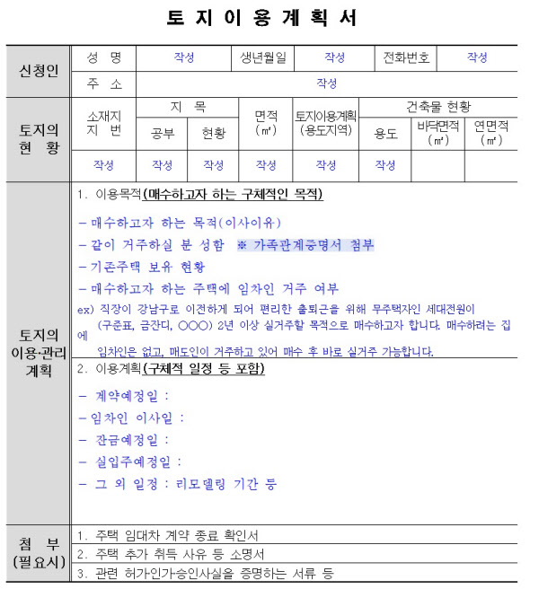 대책 이후 새롭게 토지거래허가구역으로 묶인 지역에선 앞으로 부동산을 거래하는 경우 이 서류들을 어떻게 작성해야 하는지 궁금해하는 국민들이 적지 않다. 이런 상황에서 가장 오랜 기간 토지거래허가제를 적용받아온 자치구인 강남구가 제시한 신청서 견본이 퍼지면서 국민 불만이 속출하고 있다.