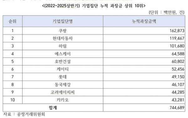 19일 국민의힘 추경호 의원이 공정위로부터 제출받은 자료에 따르면, 2022년부터 올해 상반기까지 쿠팡의 누적 과징금은 약 1628억 원으로 나타났다. 이는 같은 기간 과징금 순위 2위인 현대자동차 (1194억원)와 3위 하림 (1016억원)을 앞지르는 수치다. 이 기간 1000억원 이상의 과징금을 부과받은 기업집단은 이 세 곳뿐이다.