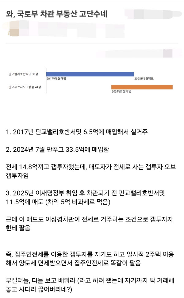 조선일보 보도에 따르면, 2017년 8월 6억4511만원에 분양받은 성남시 수정구 고등동 ‘판교밸리호반써밋’ 84㎡를 국토부 차관임명 전인 2025년 6월 11억5000만원에 매도했다. 그러면서 본인이 전세 세입자로 계약했다. 기존 소유 주택을 갭투자자에게 매도해 5억원에 가까운 시세 차익을 남긴 것이다.