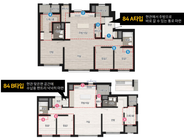 ‘오룡2지구 지엔하임’은 모든 주택형을 전용 84㎡로만 구성한다. 거실과 주방, 침실 3개, 화장실 2개를 갖춘 설계다. 이 아파트 견본주택을 방문한 사람들은 A타입 내부 구조가 독특하게 느껴진다는 의견을 보이고 있다. 현관에서 주방으로 바로 갈 수 있는 별도 통로가 있어서다. 이 같은 구조가 없는 B타입 등에는 현관 옆에 널찍한 팬트리 공간을 주는 등 특화 설계를 적용한 점이 눈에 띈다.