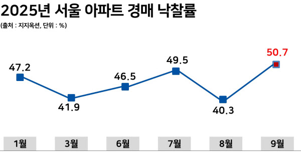 땅집고옥션에 따르면 9월(이하 1~26일 기준) 서울 아파트 경매 낙찰률은 50.7%로, 전월 40.3% 대비 10.4%포인트(p) 올랐다. 이는 2022년 6월(56.1%) 이후 3년 3개월 만에 최고치다. 특히 마포·용산·성동구 등 한강벨트 지역 낙찰률은 100%를 기록했다.