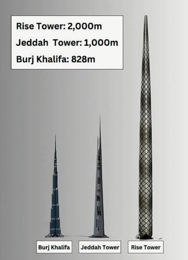 [땅집고] 사우디아라비아가 약 50억달러(7조3000억원)를 들여 최고 678층, 총 2km 높이 초고층 빌딩인 ‘라이즈 타워’를 건설하겠다는 포부를 밝혔다. 현재 전 세계에서 가장 높은 건물인 두바이 ‘부르즈 할리파’(163층·828m) 높이의 2.5배가 넘는 수준이다. 웅장한 건물 조감도가 공개되자마자 건축업계 뜨거운 감자가 됐으나 실제로 건축 실현이 될지 여부는 앞으로 지켜봐야 할 것이란 의견이 나온다.