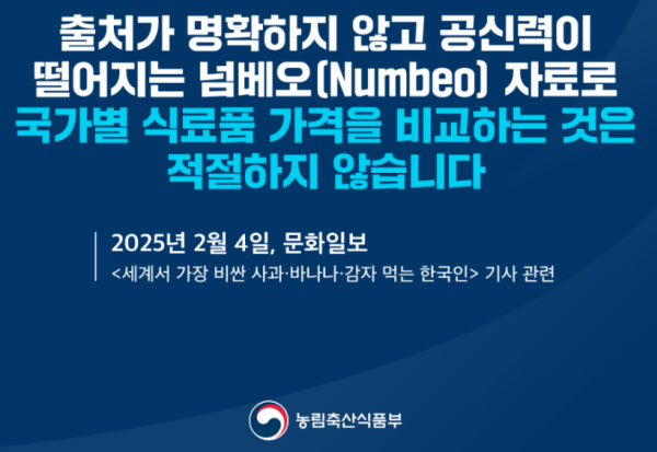 지난 2월 4일 문화일보가 ‘세계서 가장 비싼 사과·바나나·감자 먹는 한국인’이라는 기사를 작성했는데, 기사의 근거가 된 통계가 넘베오(Numbeo)였다. 당시 이와 관련, 농림축산식품부는 보도해명자료를 통해 “넘베오 지표 생성의 기반이 되는 자료는 수집 기준도 불분명하고 상품의 종류, 품질 등 다양한 변수도 반영되지 않는다”면서 “넘베오 자료를 국가별 농산물 가격 비교 지표로 활용하는 것은 적절하지 않으며, 이러한 내용을 기사화하는 것은 국민들에게 혼란을 줄 수 있으므로 인용을 자제해 주시기 바란다”고 했다. 가장 객관적인 통계에 근거해서 정책을 펼쳐야 할 중앙은행이 정부 부처가 제발 활용하지 말아달라고 호소하는 엉터리 통계를 퍼트리는데 앞장선 것이다. 한은의 신뢰성을 의존해 엉터리 통계를 대통령이 인용하는 일이 벌어지고 있다.