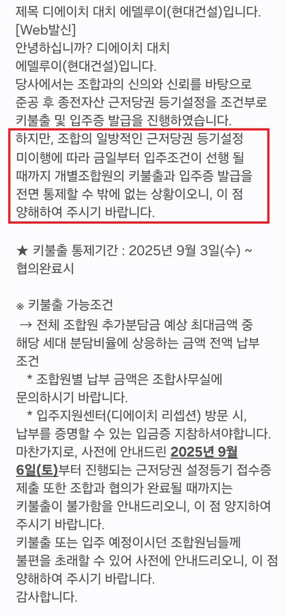 이로 인해 현재 현대건설은 상환자금 마련을 입주 조건으로 내걸고 있다. 수십억원 근저당 설정과 공증을 받아야만 키를 준다는 것이다.