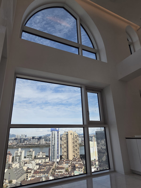 대문을 열고 들어서자마자, 층고 3m에 걸맞은 커다란 통창 너머로 배우 송중기, 가수 아이유 등이 매입해 화제인 ‘에테르노 청담’과 한강, 성수동 일대가 파노라마처럼 펼쳐졌다. 올 들어 전용 273.96㎡이 190억원에 팔린 PH129(더펜트하우스 청담)도 보였다. 강남 핵심입지인 도산대로에 들어선 고급 주거지임을 알 수 있었다.
