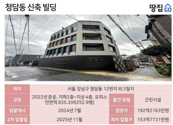 [땅집고] 대한민국 명품 1번지로 불리는 서울 강남구 청담동 한복판에 준공 3년 차 신축 상가가 감정가에서 20% 할인된 상태로 경매시장에 나왔다. 감정가 192억원에서 1회 유찰돼 최저입찰가는 153억원까지 내려왔다. 입지·건물 상태만 보면 투자자들이 ‘싸게 나왔다’고 할 만한 수준이다.