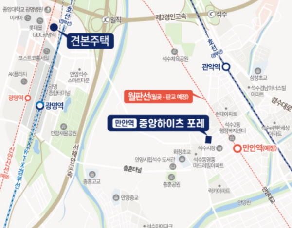 입지 측면에선 인근에 안양과 판교·시흥·광명 등을 잇는 월곶판교선 만안역이 개통하는 점을 내세워 단지명을 ‘만안역 중앙하이츠포레’로 정한 점이 눈에 띈다. 하지만 현재 월곶판교선은 아직 공사 중이며 2029년 12월에나 개통 예정이다. 이 단지가 2028년 1월 준공 예정인 점을 고려하면 향후 입주자들이 월곶판교선 이용까지 2년 정도를 기다려야 하는 셈이다. 이 밖에 현재 운행 중인 지하철 1호선 관악역까지는 걸어서 10~15분 정도 걸린다.