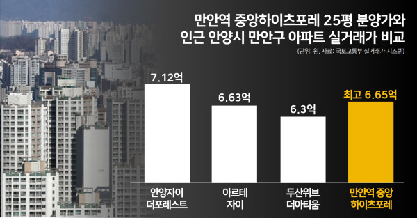 단지 규모나 브랜드 파워 측면에서 더 낫다고 평가받는 인근 ‘안양자이더포레스트’ 59㎡ 18층 분양권이 올해 9월 7억1271만원, ‘두산위브더아티움’ 24층이 6억3000만원 등에 거래됐다. 시세와 비교하면 ‘만안역 중앙하이츠포레’가 비슷한 가격이긴 하지만 체감상 소폭 비싸다는 의견이 나온다.