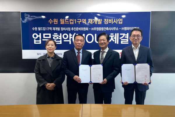 [땅집고] 경기 수원월드컵1구역 재개발정비사업 추진준비위원회는 도시계획분야에 엠와이이앤씨, 건축분야에 무영건축과 업무협약을 체결했다.