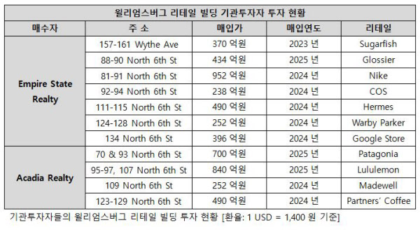 지역 내 거주 인구와 외부 방문객이 확보되자 리테일 브랜드들은 젊고 부유한 소비층을 선점하기 위해 경쟁적으로 입점하기 시작했습니다. 윌리엄스버그의 리테일 빌딩은 이제 개인 투자자를 넘어 기관투자자들까지 주목하는 자산이 됐습니다.