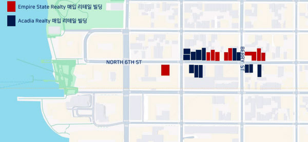 최근에는 기관투자자 ‘Empire State Realty Trust’와 ‘Acadia Realty Trust’가 지역의 핵심 상권인 ‘North 6th Street’에서 리테일 빌딩을 잇달아 매입하며 포트폴리오를 확장하고 있습니다. Empire State Realty Trust는 2024년 이후 6개 이상의 리테일 빌딩을 약 2700억원에 전액 현금 매입했고, Acadia Realty Trust는 9개 빌딩을 약 2300억원에 인수했습니다.