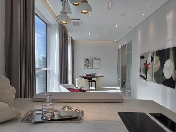 천장 높이가 3m에 달해 커다란 통창 너머로 한강과 성수동 일대가 파노라마처럼 펼쳐진다. 지상19~20층 펜트하우스는 거실 층고가 5m를 훌쩍 넘어 일반 호실보다 더욱 탁 트인 조망권을 누릴 수 있다. 일반 아파트와 비슷한 층고를 가진 2층에는 수납장과 세컨드 욕실이 딸려 있다.