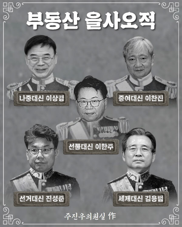 주진우 국민의힘 위원 역시 자신의 페이스북을 통해 “권력을 등에 업으려 친일했던 1905년도의 을사오적처럼 권력에 영합해 서민 주거권을 박탈한 2025년 을사년의 부동산 을사오적이 있다”면서 “자신들은 강남 살고 부동산 갭투기했으면서, 국민에겐 서울진입금지령을 내렸다”고 일갈했다.
