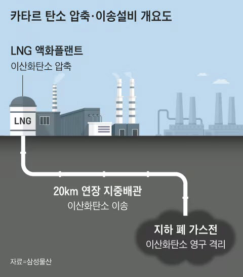 이번에 건설하는 시설은 이를 압축하고 수분을 제거한 뒤 20㎞ 연장 지중배관을 통해 폐가스전의 지하 공간으로 이송해 영구 격리하는 역할을 맡는다. 이산화탄소를 단순히 압축하는 기술뿐 아니라 안전한 이송을 위한 압력·온도 조절 등 고도의 기술이 필요하다. 삼성물산은 사업 수행을 위해 기존 카타르 LNG 프로젝트 경험 인력을 활용하고 현지에서 검증된 협력업체와 협업할 예정이다.