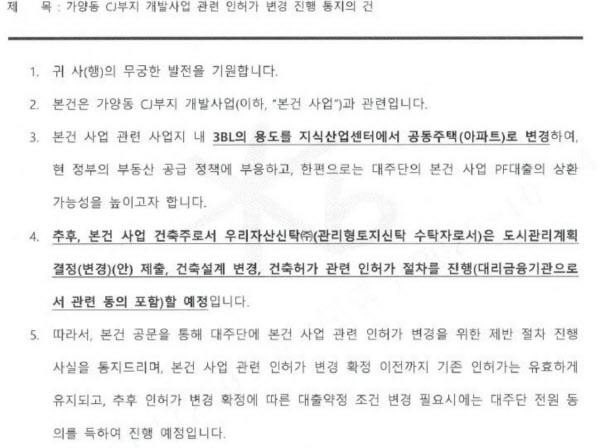 실제로 최근 사업 관계사가 대주단에 발송한 공문에 적힌 용도변경 이유로는 “현 정부의 부동산 공급 정책에 부응하고, 한편으로는 대주단의 사업 PF대출 상환 가능성을 높이기 위함”이라고 기재돼있다.