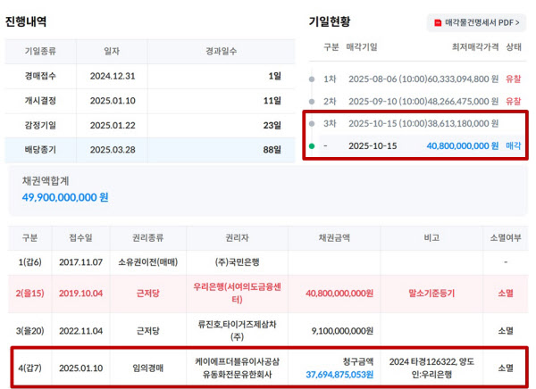 이번 경매에서 눈에 띄는 점은 단독으로 입찰한 낙찰자가 개인이나 일반 기업이 아니라, 유동화 사업을 전문으로 하는 ‘케이에프더블유이사공삼(KFW2403) 유동화전문유한회사’라는 것이다. 등기부등본상 이 건물 채권자로 올해 1월 임의경매를 신청했던 회사다.