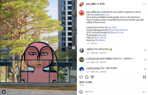 해당 조형물 설계 후 단지 안팎에서 여러 반응이 쏟아졌다. 국내에도 잘 알려진 유명 작가의 작품을 아파트 안에 설치했다는 점에서 주민이 아닌 이들도 상당한 관심을 보였다. 장 줄리앙은 동대문디자인플라자(DDP) 등 국내 컨벤션센터에서도 개인 전시를 성공적으로 개최한 적이 있다. 캐릭터 컵이나 발매트 등 굿즈(goods·상품) 로도 잘 알려져 있다. 앞서 부산 기장군 하이엔드 시니어타운 ‘VL라우어’도 조경 시설에 장 줄리앙 작품을 설치했다.