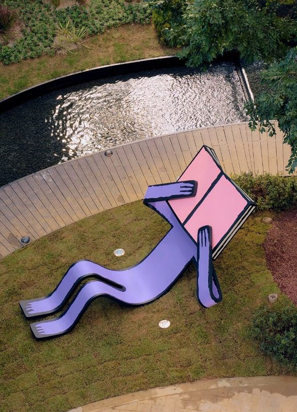 가장 키가 큰 것은 산호색 조형물이다. 지하 중앙광장에서부터 지상 1층 난간까지 이어지는 크기다. 손을 얼굴에 갖다대고 무엇인가를 지켜보는 듯한 형상이다. 수경시설 옆에 위치한 연보라색 조형물은 누워서 책을 보는 자세다. 중앙광장 한가운데에는 앉아있는 사람 모습을 한 연두색 조형물이 있다.