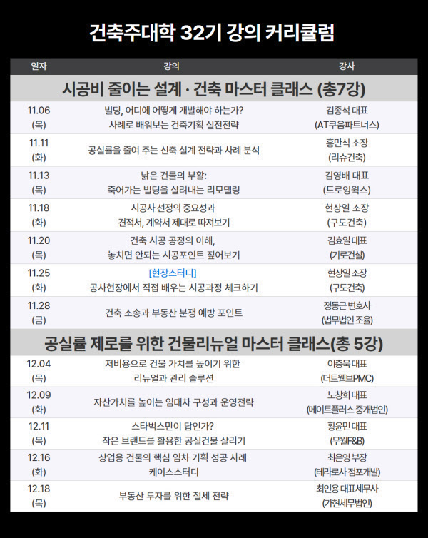 국내 최고 실전형 건축 강의인 ‘땅집고 건축주대학’이 11월 6일 32기 과정 개강을 앞두고 수강생을 모집한다. (▶바로가기) 32기 건축주대학 과정은 건축 분야에 따라 총 2가지 형태로 나눠서 수강생을 모집한다.