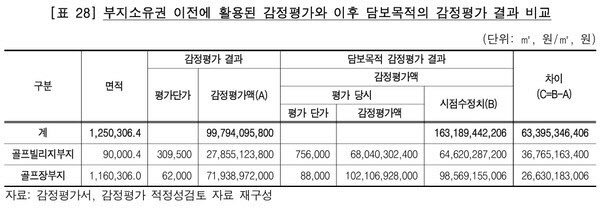 골프장 부지 평가에서도 객관적 근거 없이 획지조건이 열등하다며 인근 골프장부지 대비 절반 이상 열세하다고 저평가했다. 특히 사업시행자로부터 부풀려진 예정공사비를 검증하지 않은 채 그대로 평가에 적용한 사실도 밝혀졌다. 시행자가 감평사에 제출한 예정공사비는 1860억원이었다. 이를 감사원이 검토한 결과 실제 공사비는 이보다 466억원이 낮은 1394억원으로 확인됐다.
