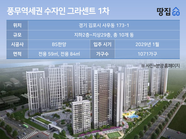 [땅집고] BS한양이 경기 김포시 사우동 173-1 일원에 ‘풍무역세권 수자인 그라센트 1차’를 분양한다. 정부의 10·15 대책으로 서울 강서구까지 규제지역으로 묶이고 수도권 신축 공급 절벽이 예상되는 가운데 최근 신규 분양이 계속된 김포 풍무역세권이 주목을 받고 있다. 마곡지구 대장 단지의 전세가격 수준으로 분양받을 수 있다.