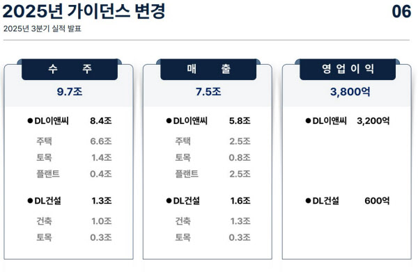DL이앤씨는 최근 잠정 실적발표를 통해 연결기준 2025년 3분기 매출 1조9070억원, 영업이익 1168억원, 신규수주 3조167억원이 예상된다고 밝혔다. 영업이익은 전년 동기 대비 40.1% 증가했다. 영업이익률도 1.8%포인트(p) 상승했다. 올해 2분기에 이어 2개 분기 연속으로 1000억원대 영업이익을 기록했다.