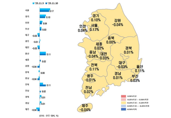 한국부동산원에 따르면 11월 둘째 주 부산 아파트 매매가격은 전주 대비 0.03% 올랐다. 상승폭은 크지 않지만, 흐름이 계속 이어지고 있다는 점이 눈에 띈다. 특히 해운대구·수영구·동래구 등 이른바 ‘해수동’ 지역이 상승장을 주도하고 있다. 해운대구는 0.20% 뛰었고, 수영구 0.10%, 동래구 0.09% 상승했다.
