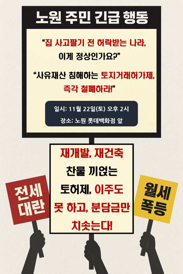 20일 업계에 따르면 노원미래도시정비사업추진단은 노원구 주민들은 오는 22일 오후 2시 노원구 상계동 롯데백화점 앞에서 토지거래허가제 지정에 반대하는 집회를 열 예정이다.