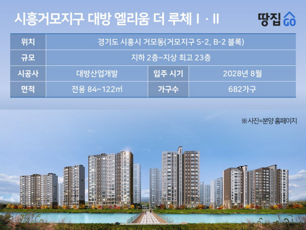 [땅집고] 이달 대방산업개발이 경기 시흥시 거모동에 ‘시흥거모지구 대방 엘리움 더 루체Ⅰ·Ⅱ’를 분양한다. 시흥 거모지구에서 처음으로 분양하는 민간건설사 아파트면서, 시흥시가 10·15 부동산 대책 적용을 받지 않아 규제를 피한 수혜 단지로도 홍보 중이다.