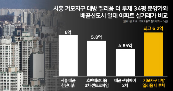 현재 시흥시 부동산 시장에서 주거 선호도가 가장 높은 지역은 배곧신도시다. 올해 들어 이 일대 아파트가 5억~6억원대에 거래 중이다. 84㎡ 기준으로 ‘시흥배곧 한신더휴’(2018년·1358가구) 17층이 지난달 2일 6억원, ‘호반베르디움 3차 센트로하임’(2017년·1647가구) 11층이 이달 6일 5억8000만원에 팔리는 등이다. 배곧신도시 아파트와 비교하면 이번에 분양하는 ‘시흥거모지구 대방 엘리움 더 루체’가 더 비싸다는 계산이 나온다.