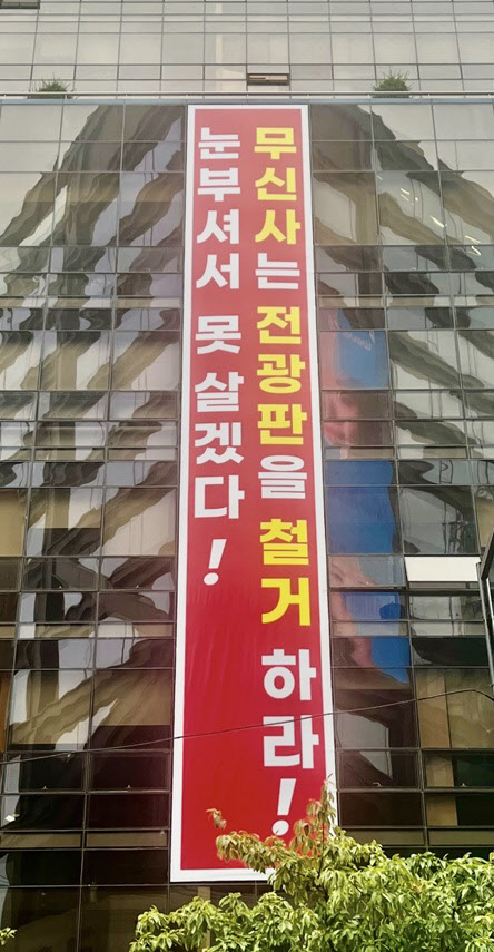 결국 입주사들은 ‘서울숲 한라 시그마밸리 빌딩’ 외벽에 무신사 측에 전광판을 철거해달라는 빨간 현수막을 내걸고 강력 대응에 나섰다. 이 현수막에는 ‘눈부셔서 못살겠다! 무산사는 전광판을 철거하라!’, ‘무신사는 흉물스런 전광판을 철거하라!’는 등 문구가 적혀 있다.