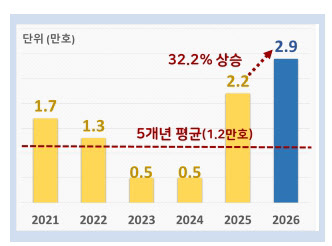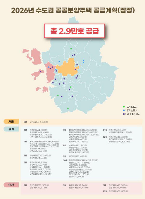 26일 국토교통부는 한국토지주택공사(LH), 서울주택도시공사(SH), 경기주택도시공사(GH), 인천도시공사(IH) 4개 기관과 함께 ‘2026년 수도권 공공택지 공공분양 공급계획’을 발표하고 지난 9.7 공급대책에서 발표한 공공주택 공급 물량보다 2000가구 늘어난 2만9000가구를 분양하겠다고 밝혔다. 이는 4개 공공기관의 올해 분양 물량 2만2000가구보다 32.2% 증가한 수치이며, 최근 5년간 평균 수도권 분양물량 1만2000가구의 2.3배 규모다.