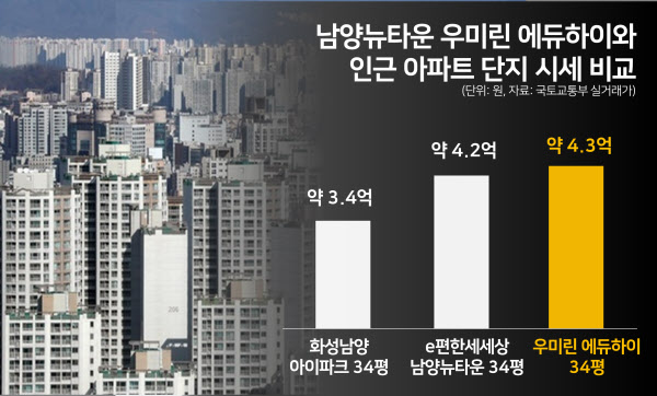 분양가상한제를 적용받는 단지임에도 분양가는 결코 낮지 않다. 전용 84㎡ 기준 4억1290만~4억5840만원으로 책정했다. 단지 맞은편 화성남양아이파크와 남양 우림필유(전용 84㎡) 최근 시세는 약 3억3000만원이다. 유상 옵션까지 고려하면 우미린 에듀하이 분양가는 현 시세보다 1억 이상 높은 수준이다.