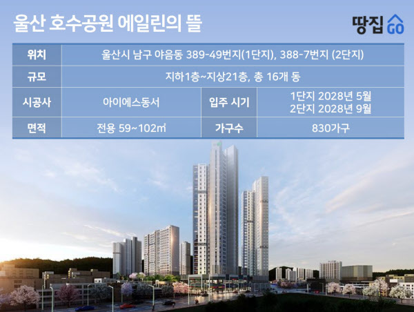 울산 호수공원 에일린의 뜰은 울산시 남구 야음동 389-49번지(1단지)와 388-7번지 일원(2단지)에 위치한다. 1단지는 지하 2층~지상 25층 4개동 규모로 310가구이다. 전용 84㎡와 102㎡으로 구성했다. 2단지는 지하 3층~지상 33층 2개동, 220가구로, 전용 59㎡와 84㎡ 중소형으로만 구성했다. 총 520가구 규모다. 수요자들의 주거선호도가 높은 중소형 평형부터 대형 평형까지 선택의 폭을 넓힌 것이 특징이다. 12월 1일 특별공급을 시작으로 2일 1순위, 3일 2순위 청약을 진행한다. 당첨자는 1단지는 9일, 2단지는 10일 발표한다. 계약은 22~24일 진행할 예정이다. 입주는 1단지가 2028년 5월, 2단지는 2028년 9월 예정이다.