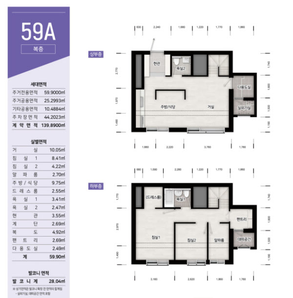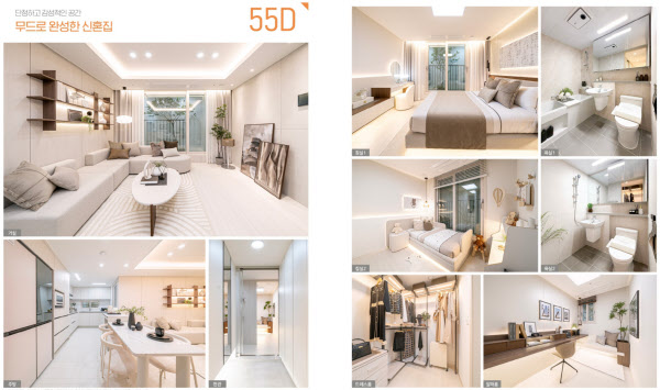 이 아파트는 주택형이 다양하게 구성된 것이 특징이다. 55㎡A 주택형은 알파룸 옵션으로 방을 3개 만들 수 있다. 특히 59㎡A 주택형은 복층형으로 설계돼 눈길을 끈다. 상부층에 거실과 주방, 욕실 등이 있고 아래층에 침실 두 개와 알파룸, 펜트리, 드레스룸, 욕실 등으로 구성됐다.