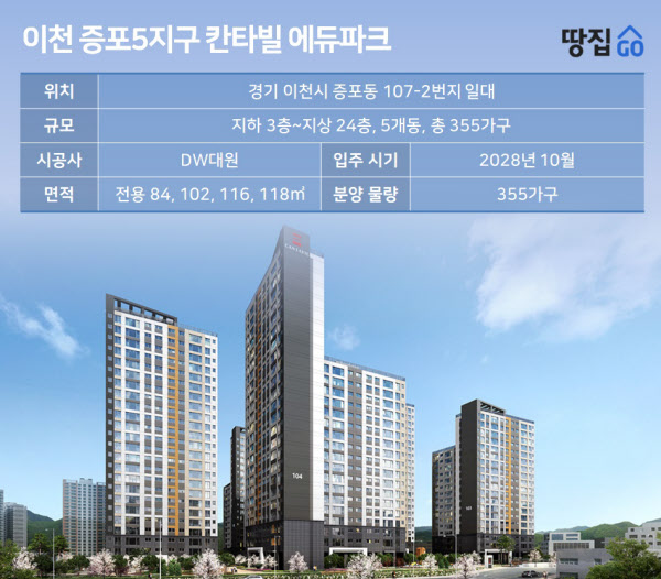 ‘이천 증포5지구 칸타빌 에듀파크’는 이천시 증포동 107-2일대에 조성하는 증포5지구 도시개발구역에 지하 3층~지하 24층 5개동 총 355가구 규모로 짓는 아파트다. 모든 물량을 일반분양한다. 이달 8일 특별공급, 9일 1순위 청약을 받으며 입주 예정월은 2028년 10월이다. 시행과 시공 모두 DW대원이다.