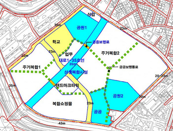 문제는 챔피언스시티 남측에 들어서는 랜드마크타워가 이 기준을 만족시키지 못했다는 점이다. 랜드마크시설은 학교 예정 부지 경계선으로부터 200m 안에 있어 교육환경영향평가 대상이다. 전남·일신방직(전일방) 부지 약 30만㎡를 대상으로 진행한 교육환경영향평가에서 초고층 주거복합시설 2개 블록은 일조 확보 조건을 충족한 반면, 랜드마크타워는 25층 이하일 때만 기준을 만족한 것으로 확인됐다. 업무시설의 경우 저층은 2층, 고층 구간은 15층 이하로만 일조 기준을 맞출 수 있는 상황이다. 교육청 관계자는 “신설 학교 일조권을 확보하는 것은 필수”라며 "일조량, 특히 초등학교 일조시간은 성장기 아동들의 건강권과 학습권에 큰 영향을 미치기 때문에 엄격하게 적용할 필요가 있다"고 했다.