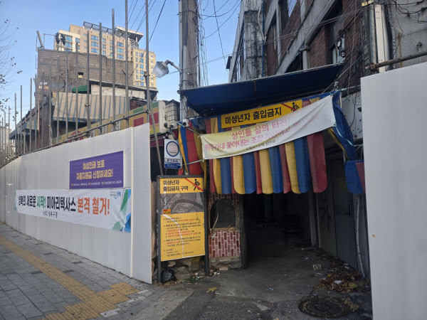 철거 작업은 지난해 12월부터 주거지와 일반영업 지역 등 부분적으로 이뤄졌으며 현재 철거율 54.3%다. 사업지 내 미아리 텍사스 철거는 지난달 24일부터 진행했다. 성북구는 내년 상반기 중 철거를 완료할 계획이며, 내년 말 착공을 목표로 삼고 있다. 현재 구역 대부분 부지에 가벽이 설치돼있는 가운데 아직 미아리 텍사스 시절 걸어뒀던 ‘미성년자 출입금지’ 팻말이 곳곳에 보인다.