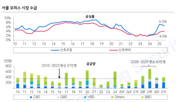 또한 “서울 오피스는 장기간 자연 공실률 5%를 하회하다가 2024년 말 마곡 20만평 공급으로 공실률이 소폭 상승했다”며 “도심권역(CBD)와 강남권역(GBD)은 확장 개발, 여의도권역(YBD)은 재건축 활성화로 2029년부터 오피스 공급이 증가할 것”으로 내다봤다. 그 규모는 예년 평균 2배 수준인 연 60만평 공급이 예상된다고 했다. 다만 “이 같은 공급 증가가 서울 오피스 시장의 장기 침체를 야기할 가능성은 낮다”며 “오피스 소유주들이 대규모 복합 개발 준공에 대비한 임차인 사전 관리와 용도 전환 개발, 엑시트 전략 구상이 활발해질 전망”이라고 했다.