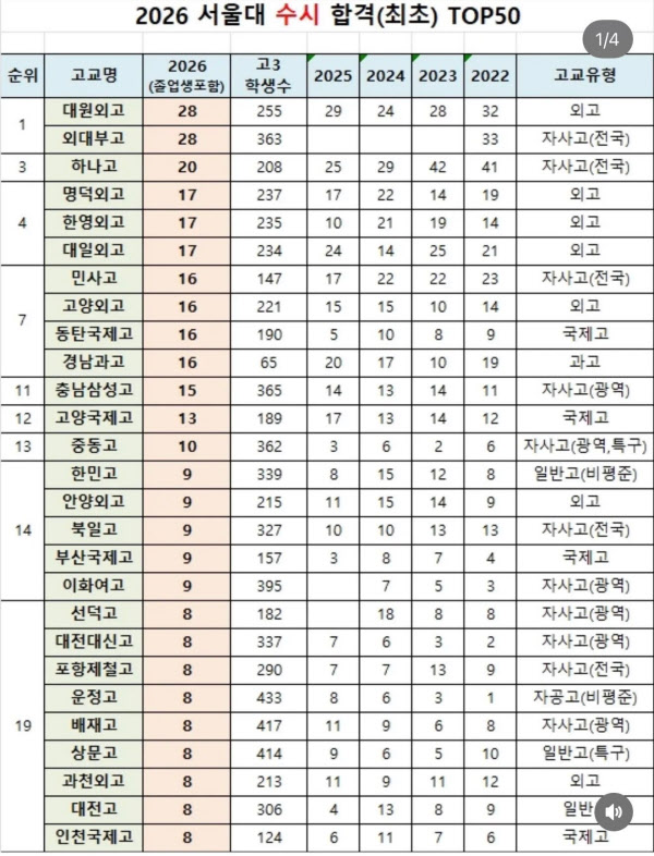 한편 특목고와 자사고 가운데서는 대원외고와 외대부고가 각각 서울대 수시 합격자 28명을 배출하면서 공동 1위에 올랐다. 두 학교 모두 재학생 27명, 졸업생 1명을 합산한 수치다. 이어 하나고가 20명, 대일외고·명덕외고·한영외고가 각각 17명씩 합격자를 냈다. 고양외고, 동탄국제고, 경남과학고는 각 16명으로 뒤를 이었다.