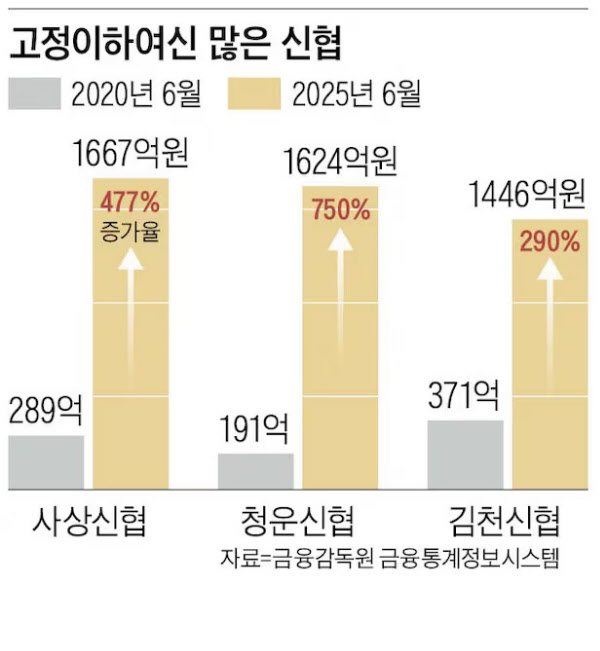 증가 속도는 더욱 가파르다. 청운신협, 사상신협, 김천신협의 고정이하여신은 2020년만 해도 각각 400억원 미만이었다. 하지만 5년 만에 최대 8배 넘게 치솟았다. 증가율은 청운신협이 750%로 가장 높고, 사상신협 477%, 김천신협 290%다.