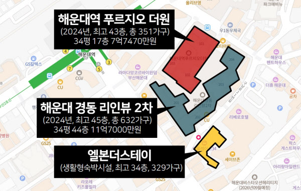 국토교통부 실거래가 시스템에 따르면 국민평형인 전용 84㎡(34평) 기준으로 ‘해운대 경동 리인뷰 2차’는 중층에 해당하는 22층 주택이 올해 11월 9억6922만원, 이달 2일 44층 고층이 11억7000만원에 각각 거래됐다. 지역 내에서 고가 아파트 반열에 해당한다. ‘해운대역 푸르지오 더원’도 올해 3월 중층인 17층 주택이 7억7470만원에 팔렸을 정도로 집값이 낮지 않다.