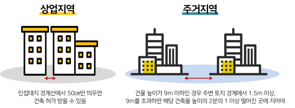 현행 건축법상 상업지역에 짓는 건물에 대해서는 주거지역에 들어서는 건물과 달리 일조권이나 조망권을 확보할 의무가 없다. 인접대지 경계선에서 단 50cm 떨어진 곳에서라면 얼마든지 건축 허가를 받을 수 있는 것. 반면 주거지역에 건물을 짓는 경우 ▲건축물 높이가 9m 이하일 경우 인접 대지경계선으로부터 1.5m 이상 ▲건축물 높이가 9m 를 초과하는 경우 해당 건축물 높이의 2분의 1 이상 이격거리를 보장받을 수 있다.