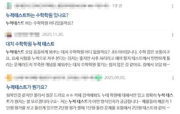 ‘누테’의 등장은 10여년 전, 국내 1순위 학군지인 강남구 대치동이었다. ‘레테(레벨 테스트)’처럼 통용되는 단어는 아니었으나, 일부 학부모들은 ‘누적테스트’ 학원을 묻는 등 관련 정보를 공유했던 것으로 전해진다.