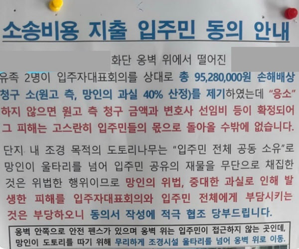 결국 입주자대표회의는 A씨 유족들이 제기한 손해배상 소송에 응소하기로 결정하고, 입주민들에게 소송비용 지출에 대한 동의서를 걷겠다는 안내문을 게시했다.