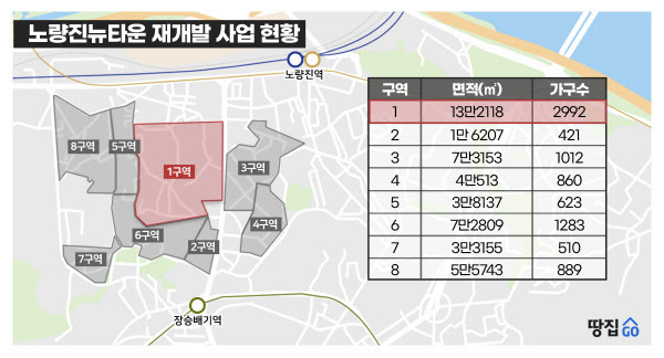 노량진1구역은 서울 동작구 노량진동 일대 13만2132㎡ 부지에 총 2992가구 규모 아파트를 조성하는 사업이다. 노량진뉴타운 총 8개 구역 중 규모가 가장 커 상징성 있다는 평가다. 지하철 1·9 호선 노량진역 초역세권 입지에 평지고, 한강 조망이 가능하다 점에서 사업성이 높기도 하다. 시공사는 지난해 포스코이앤씨로 선정됐다.